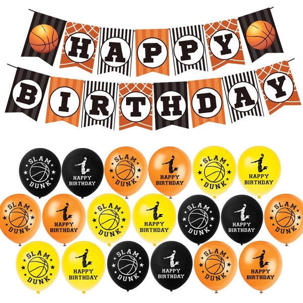 1 pc Basketball Birthday Paper Banner 1 Set of 18pcs 12-inch Basketball Latex Balloons (6 Yellow, 6 Orange, 6 Black) 1 Set of 24pcs Basketball Paper Cupcake Toppers 1 pc Basketball Large Paper Cake Topper 1 pc Ribbon String