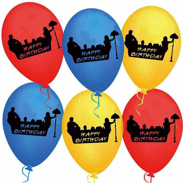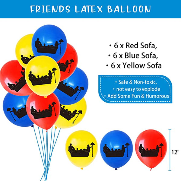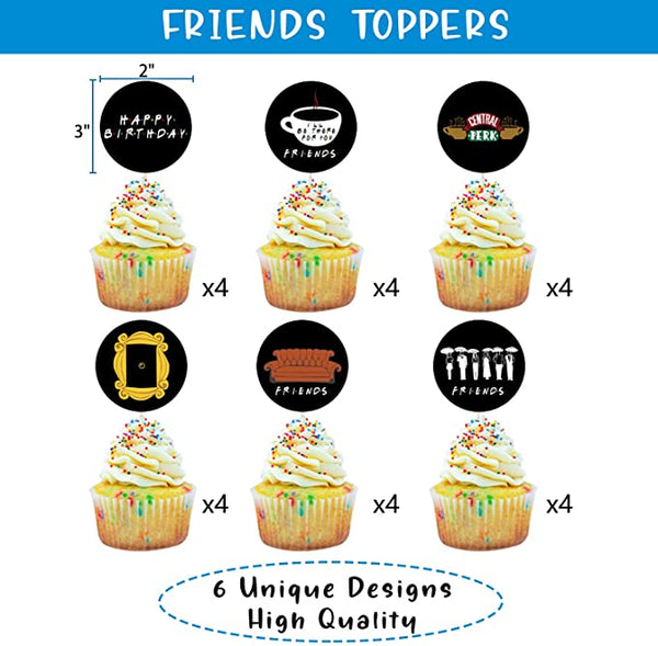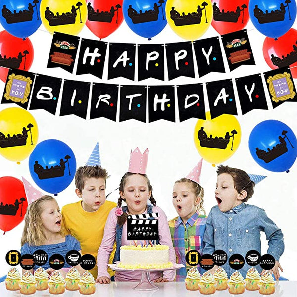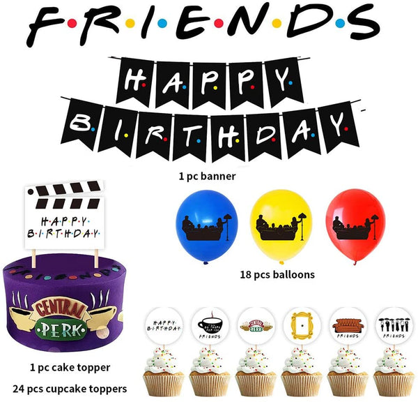 - SET INCLUDES: 1 pc Friends Paper Birthday Banner 1 Set of 18 pcs 12-inch Friends Latex Balloons (6 Blue, 6 Yellow, 6 Red) 1 Set of 24 pcs Friends Paper Cupcake Toppers 1 pc Friends Large Paper Cake Topper